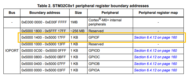 Step 1. Select the memory or peripheral’s whose registers you want to read out. As an example, we will select GPIOF’s registers to review. According to table 2 in the STM32C0’s reference manual, GPIOF’s start boundary address is 0x5000_1400.