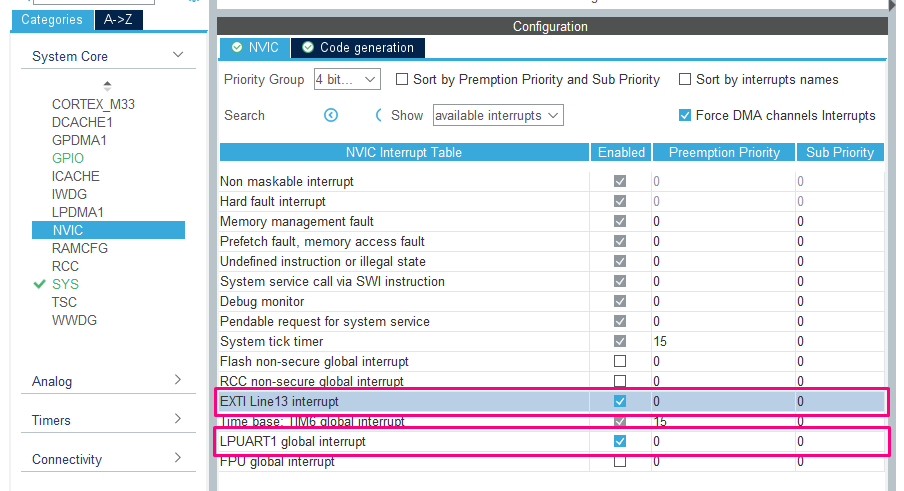 Back to the System Core tab, open the NVIC and enable both EXTI Line 13 and LPUART global interrupts.