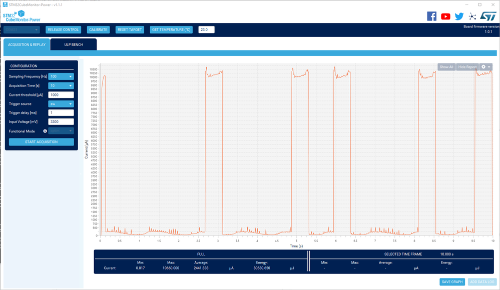 The occurrence of interruptions wakes-up the MCU and the entry of DefaultTask into run mode are indicated by the current peaks, while the low current consumption signifies the periods during which the MCU is in STOP2 Mode.