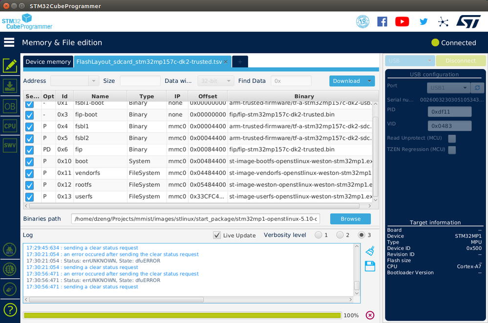 Finally got Linux version of CubeProg connected through USB. However programming failed twice already: