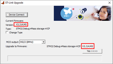 Anyhow, I followed your instruction and downloaded the ST-link upgrade from: https://www.st.com/en/development-tools/stsw-link007.html?dl=redirect . I started the ST-LinkUpgrade.exe tool and the current version match the "Upgrade to Firmware" field: