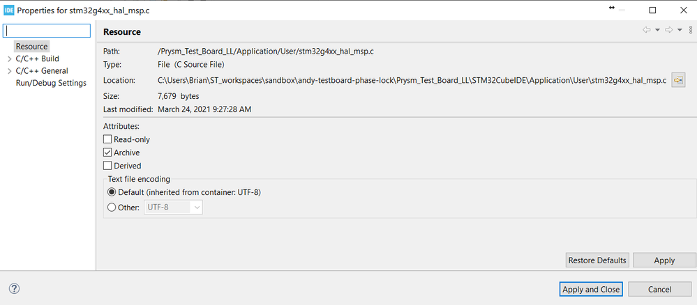 I did a drag & drop into the ..\Application\User folder where the other project C files are shown . The new file stm32g4xx_hal_msp.c still shows up with a line across the icon. If I add an intentional error in the file it compiles the project with 0 errors. If I click on the file properties I get what is shown below: