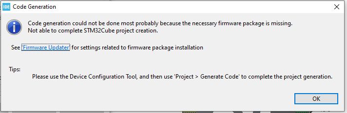 I downloaded STM32CubeIDE and went to create a new STM32 Project. I selected my dev board and the firmware files automatically downloaded and unzipped. I then accepted all the default settings, however the error "Code generation could not be done because the necessary firmware package is missing. Not able to complete STM32Cube project creation." was thrown (and is thrown every time I try).