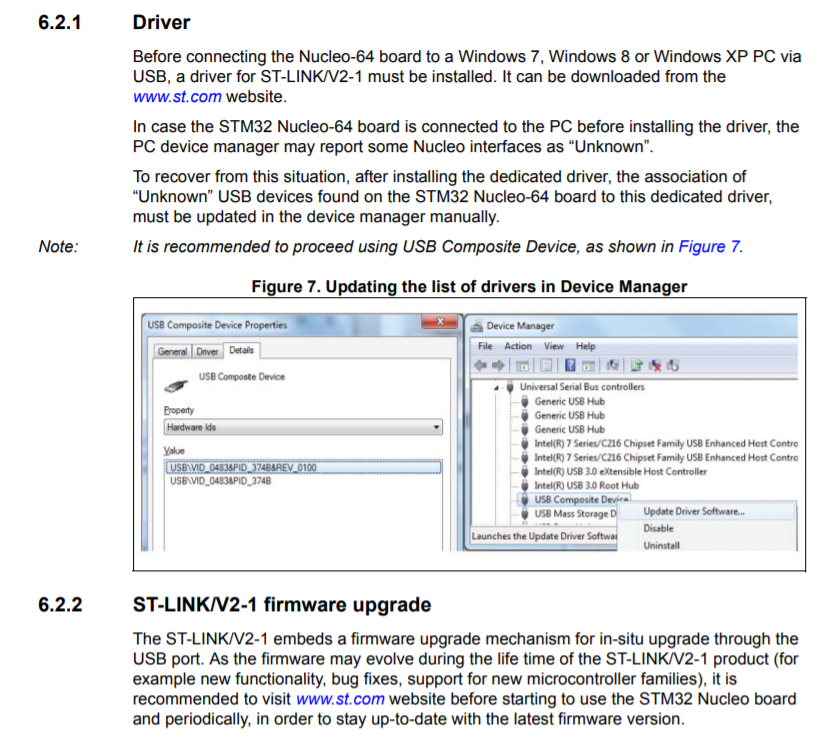 I also found a section talking about if the Nucleo was plugged in to the computer before the driver was installed, it could lead to the device being "unknown". I'm not sure if I am guilty of this, but I followed their process for recovering if this was the case. It also told me that my "USB Composite Device" is up to date and wouldn't update the driver.