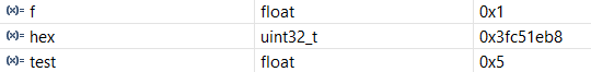memcpy(&f, &hex, 4);If i go into Live Expressions i get that f = 0x1 (hex), it should be f = 0x3fc51eb8. The strangest thing is that the same code works for example on an onlineGDB compiler.
