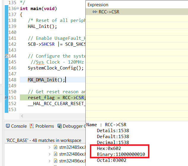I have tried reading the registers after basic system init and immediately upon entering main() with the same result. Below are two tests that read RCC->CSR just after calling NVIC_SystemReset().