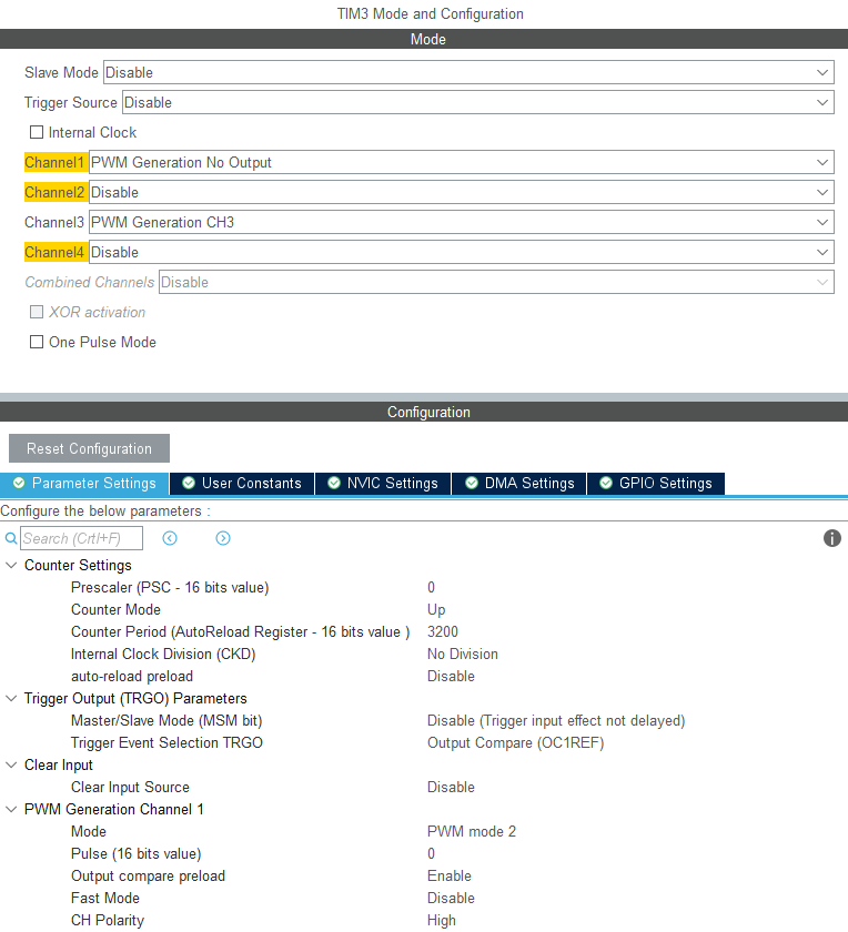 I am using STM32G431F4P MCU. I am using Timer3-Channel3 PWM output. PWM frequency is 20 kHz. ADC1 is DMA mode and i want to trigger ADC1 using Timer3-Channel1 (PWM generation no output). Timer3 and ADC1 settings are as follows;