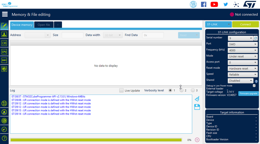 I have big problems in using the STM32CubeProgrammer (latest release). My hardware setup is nothing special ... It's a STM32F407 connected to a ST-Link device (3.3V, GND, DIO, CLK).