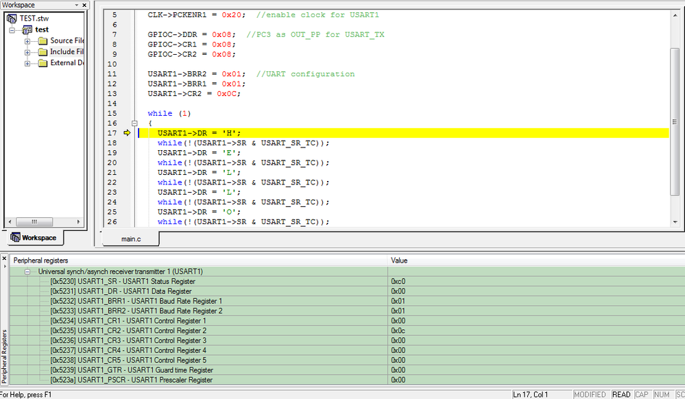 { CLK->PCKENR1 = 0x20; //enable clock for USART1 GPIOC->DDR = 0x08; //PC3 as OUT_PP for USART_TX GPIOC->CR1 = 0x08; GPIOC->CR2 = 0x08; USART1->BRR2 = 0x01; //UART configuration USART1->BRR1 = 0x01; USART1->CR2 = 0x0C;while (1)